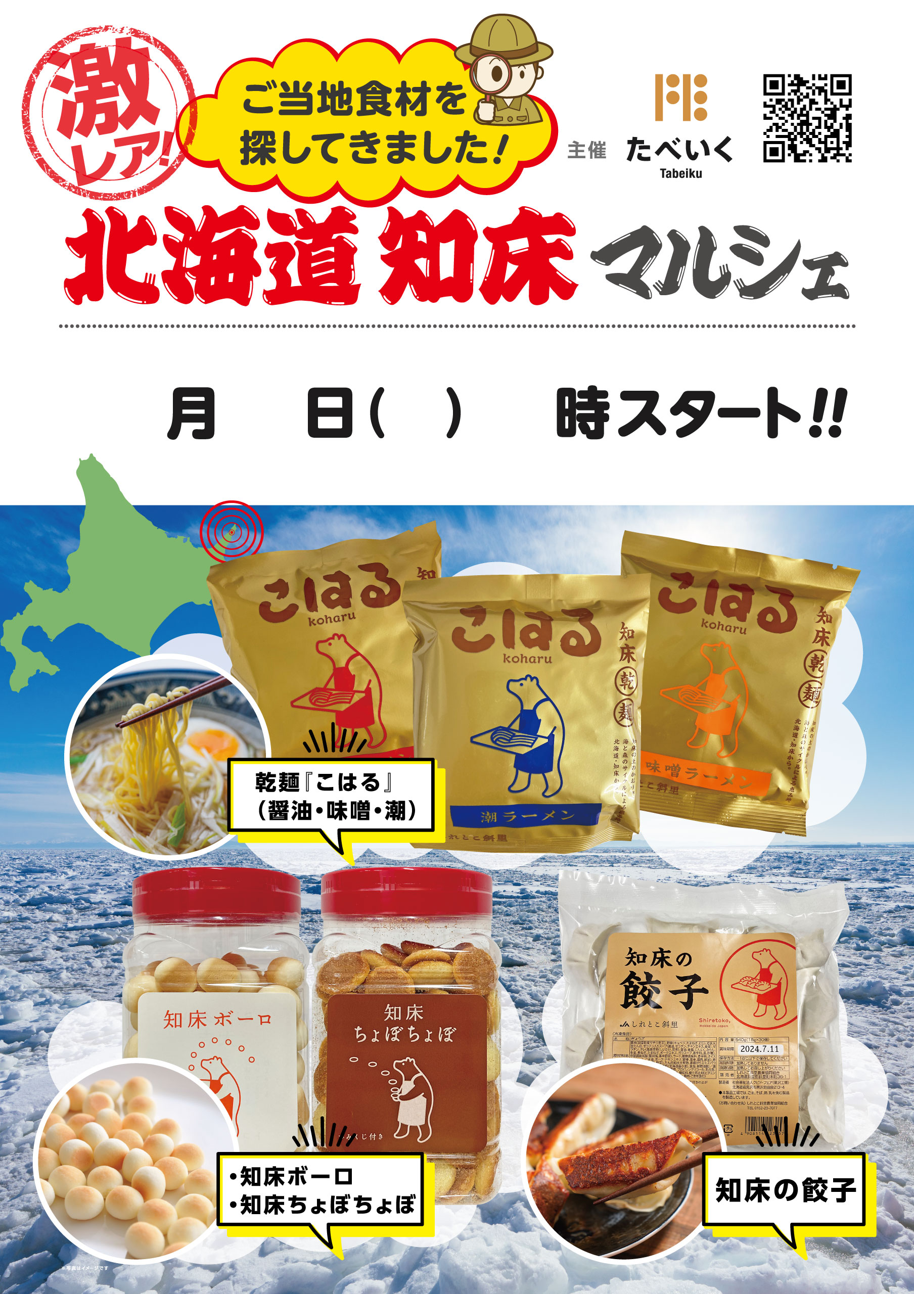北海道の知床半島にある「斜里町」の特産物をイベントキットにしてみました。 斜里町は、北海道の東部、オホーツク海に面した知床半島にある農業や観光が盛んな町です。「知床」は世界自然遺産にも登録された大自然が堪能できる場所です。 「北海道・知床マルシェ」の商品ラインナップ 乾麺(こはる)塩ラーメン お菓子:知床ボーロ 乾麺(こはる)醤油ラーメン お菓子:知床ちょぼちょぼ 乾麺(こはる)味噌ラーメン 知床餃子(30個入り) 検索カテゴリー 開催店舗様用販促素材 商品ラインナップ 冷凍食品 販促ノート ご当地食材 コストコ ノベルティ ゲーム お知らせ パン スイーツ 魚 肉 フルーツ 野菜 たまご 未分類